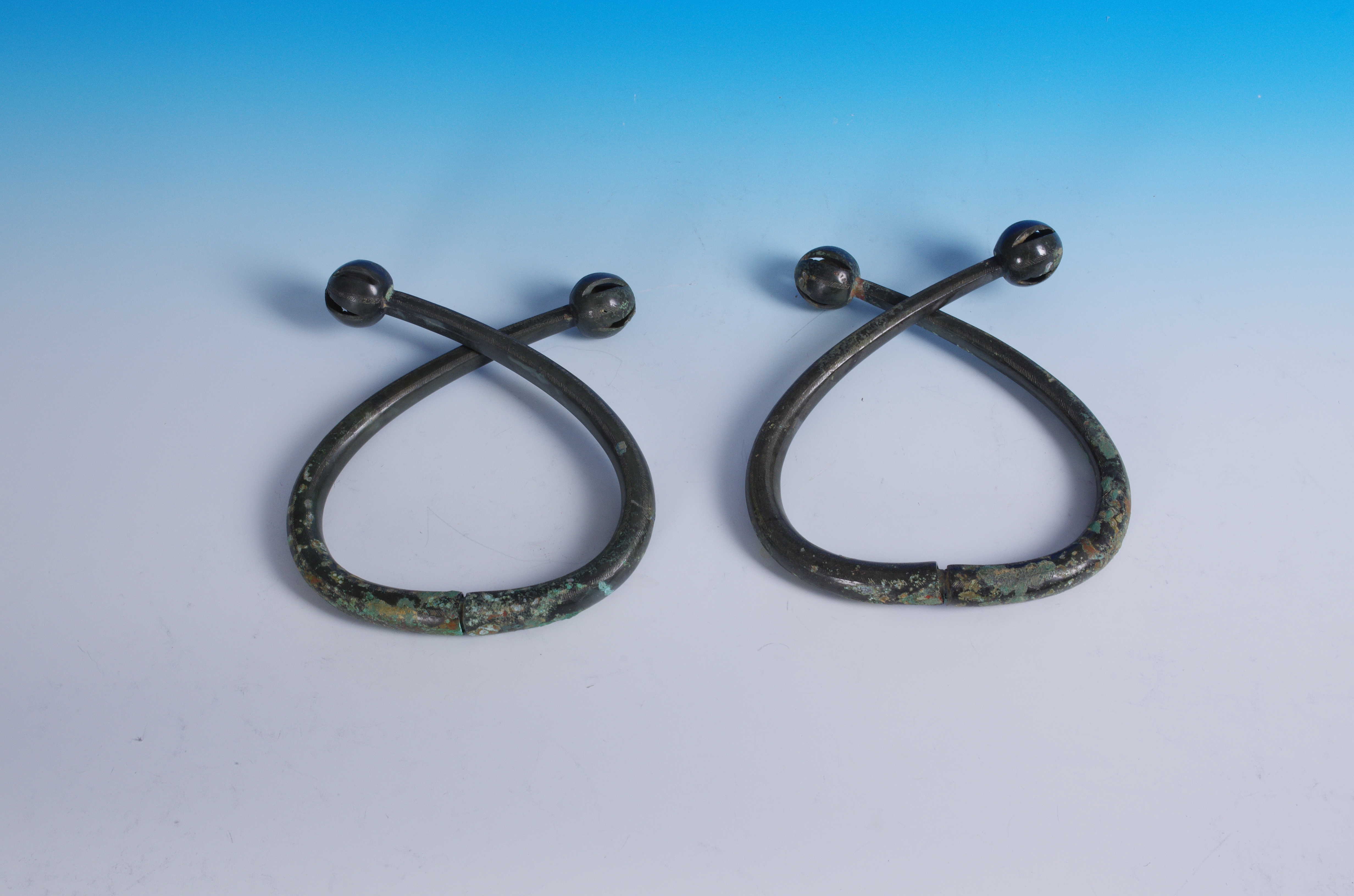 쌍두령과 함께 청동기시대의 의구로서 환상(環狀) 쌍두령이라고도 한다. 두 개의 둥글게 휜 동봉(銅棒)의 한쪽 끝에 방울을 달고, 반대편 끝은 장부식으로 끼워 ‘X’자상으로 연결하였다. 전체적으로 소의 코뚜레 모양이며, 길이는 19.3㎝이다. 연결부에서 가까운 곳에 방형 구멍을 한 개를 뚫어 나무자루 같은 것에 끼우거나 매달아 흔들었을 것으로 추정된다. 방울은 약간 납작한 타원형으로 길게 째진 4개의 절개구가 있으며, 그 사이에는 짧은 집선으로 절개구 모양의 문양이 음각되어 있다. 이 조합식 쌍두령은 의기(儀器)의 일종으로 청동기시대부터 초기 철기시대에 이르기까지 제작되었으며 일반적으로 청동 간두령·청동 거울·청동 팔주령과 함께 출토된다. 현재 국보 제146-3호로 삼성미술관 리움 소장품 등 몇 점이 알려져 있는데, 본 박물관에 소장된 것이 보존 상태가 가장 양호하다. |